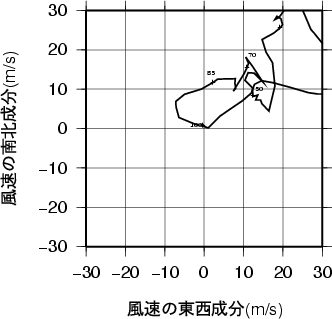 表中のMUCAPE850hPaは、最不安定CAPE(地上~850hPa高度間で)を示す。 気温、露点の鉛直分布(エマグラム)輪島 2000年09月11日21時(高層気象観測データを使用)![]() 赤線は、地表付近の空気塊を仮想的に上昇させたときの空気塊の温度の変化を示す。 湿球温位、温位、相当温位、飽和相当温位の鉛直分布輪島 2000年09月11日21時(高層気象観測データを使用)![]() 風のホドグラフ(広域)輪島 2000年09月11日21時(高層気象観測データを使用)![]() 風のホドグラフ(拡大)輪島 2000年09月11日21時(高層気象観測データを使用)![]() |