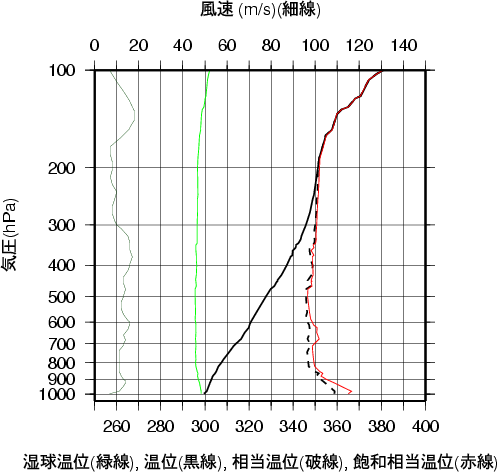 表中のMUCAPE850hPaは、最不安定CAPE(地上~850hPa高度間で)を示す。 気温、露点の鉛直分布(エマグラム)潮岬 2000年09月11日21時(高層気象観測データを使用)![]() 赤線は、地表付近の空気塊を仮想的に上昇させたときの空気塊の温度の変化を示す。 湿球温位、温位、相当温位、飽和相当温位の鉛直分布潮岬 2000年09月11日21時(高層気象観測データを使用)![]() 風のホドグラフ(広域)潮岬 2000年09月11日21時(高層気象観測データを使用)![]() 風のホドグラフ(拡大)潮岬 2000年09月11日21時(高層気象観測データを使用)![]() |