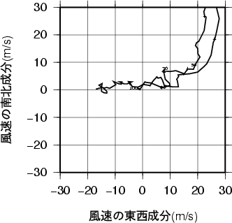 表中のMUCAPE850hPaは、最不安定CAPE(地上~850hPa高度間で)を示す。 気温、露点の鉛直分布(エマグラム)札幌 2001年06月29日09時(高層気象観測データを使用)![]() 赤線は、地表付近の空気塊を仮想的に上昇させたときの空気塊の温度の変化を示す。 湿球温位、温位、相当温位、飽和相当温位の鉛直分布札幌 2001年06月29日09時(高層気象観測データを使用)![]() 風のホドグラフ(広域)札幌 2001年06月29日09時(高層気象観測データを使用)![]() 風のホドグラフ(拡大)札幌 2001年06月29日09時(高層気象観測データを使用)![]() |