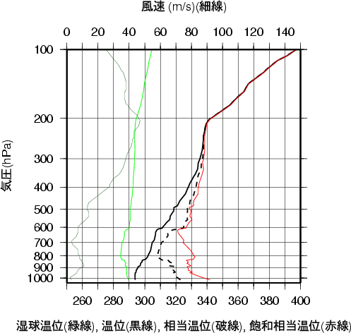 表中のMUCAPE850hPaは、最不安定CAPE(地上~850hPa高度間で)を示す。 気温、露点の鉛直分布(エマグラム)鹿児島 2001年10月27日09時(高層気象観測データを使用)![]() 赤線は、地表付近の空気塊を仮想的に上昇させたときの空気塊の温度の変化を示す。 湿球温位、温位、相当温位、飽和相当温位の鉛直分布鹿児島 2001年10月27日09時(高層気象観測データを使用)![]() 風のホドグラフ(広域)鹿児島 2001年10月27日09時(高層気象観測データを使用)![]() 風のホドグラフ(拡大)鹿児島 2001年10月27日09時(高層気象観測データを使用)![]() |