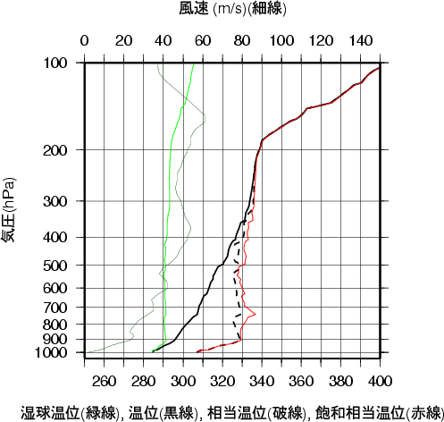 表中のMUCAPE850hPaは、最不安定CAPE(地上~850hPa高度間で)を示す。 気温、露点の鉛直分布(エマグラム)館野 2001年11月06日09時(高層気象観測データを使用)![]() 赤線は、地表付近の空気塊を仮想的に上昇させたときの空気塊の温度の変化を示す。 湿球温位、温位、相当温位、飽和相当温位の鉛直分布館野 2001年11月06日09時(高層気象観測データを使用)![]() 風のホドグラフ(広域)館野 2001年11月06日09時(高層気象観測データを使用)![]() 風のホドグラフ(拡大)館野 2001年11月06日09時(高層気象観測データを使用)![]() |