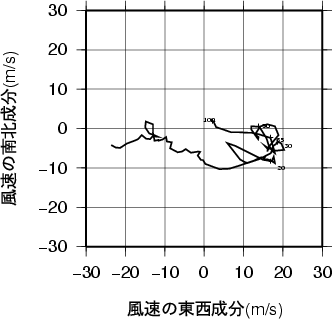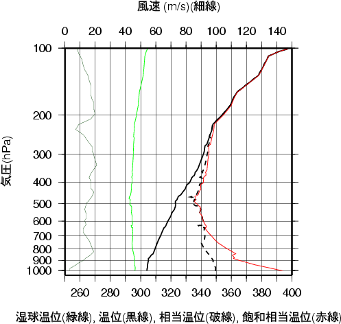 表中のMUCAPE850hPaは、最不安定CAPE(地上~850hPa高度間で)を示す。 気温、露点の鉛直分布(エマグラム)仙台 2002年08月01日21時(高層気象観測データを使用)![]() 赤線は、地表付近の空気塊を仮想的に上昇させたときの空気塊の温度の変化を示す。 湿球温位、温位、相当温位、飽和相当温位の鉛直分布仙台 2002年08月01日21時(高層気象観測データを使用)![]() 風のホドグラフ(広域)仙台 2002年08月01日21時(高層気象観測データを使用)![]() 風のホドグラフ(拡大)仙台 2002年08月01日21時(高層気象観測データを使用)![]() |