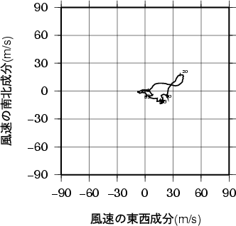 表中のMUCAPE850hPaは、最不安定CAPE(地上~850hPa高度間で)を示す。 気温、露点の鉛直分布(エマグラム)福岡 2002年10月15日21時(高層気象観測データを使用)![]() 赤線は、地表付近の空気塊を仮想的に上昇させたときの空気塊の温度の変化を示す。 湿球温位、温位、相当温位、飽和相当温位の鉛直分布福岡 2002年10月15日21時(高層気象観測データを使用)![]() 風のホドグラフ(広域)福岡 2002年10月15日21時(高層気象観測データを使用)![]() 風のホドグラフ(拡大)福岡 2002年10月15日21時(高層気象観測データを使用)![]() |