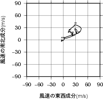 表中のMUCAPE850hPaは、最不安定CAPE(地上~850hPa高度間で)を示す。 気温、露点の鉛直分布(エマグラム)輪島 2002年10月15日21時(高層気象観測データを使用)![]() 赤線は、地表付近の空気塊を仮想的に上昇させたときの空気塊の温度の変化を示す。 湿球温位、温位、相当温位、飽和相当温位の鉛直分布輪島 2002年10月15日21時(高層気象観測データを使用)![]() 風のホドグラフ(広域)輪島 2002年10月15日21時(高層気象観測データを使用)![]() 風のホドグラフ(拡大)輪島 2002年10月15日21時(高層気象観測データを使用)![]() |