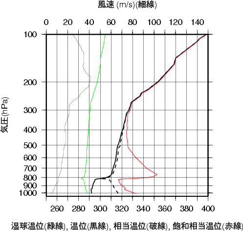 表中のMUCAPE850hPaは、最不安定CAPE(地上~850hPa高度間で)を示す。 気温、露点の鉛直分布(エマグラム)潮岬 2002年10月16日09時(高層気象観測データを使用)![]() 赤線は、地表付近の空気塊を仮想的に上昇させたときの空気塊の温度の変化を示す。 湿球温位、温位、相当温位、飽和相当温位の鉛直分布潮岬 2002年10月16日09時(高層気象観測データを使用)![]() 風のホドグラフ(広域)潮岬 2002年10月16日09時(高層気象観測データを使用)![]() 風のホドグラフ(拡大)潮岬 2002年10月16日09時(高層気象観測データを使用)![]() |