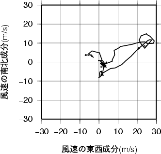 表中のMUCAPE850hPaは、最不安定CAPE(地上~850hPa高度間で)を示す。 気温、露点の鉛直分布(エマグラム)秋田 2002年10月16日09時(高層気象観測データを使用)![]() 赤線は、地表付近の空気塊を仮想的に上昇させたときの空気塊の温度の変化を示す。 湿球温位、温位、相当温位、飽和相当温位の鉛直分布秋田 2002年10月16日09時(高層気象観測データを使用)![]() 風のホドグラフ(広域)秋田 2002年10月16日09時(高層気象観測データを使用)![]() 風のホドグラフ(拡大)秋田 2002年10月16日09時(高層気象観測データを使用)![]() |