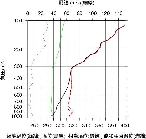 表中のMUCAPE850hPaは、最不安定CAPE(地上~850hPa高度間で)を示す。 気温、露点の鉛直分布(エマグラム)秋田 2002年10月16日09時(高層気象観測データを使用)![]() 赤線は、地表付近の空気塊を仮想的に上昇させたときの空気塊の温度の変化を示す。 湿球温位、温位、相当温位、飽和相当温位の鉛直分布秋田 2002年10月16日09時(高層気象観測データを使用)![]() 風のホドグラフ(広域)秋田 2002年10月16日09時(高層気象観測データを使用)![]() 風のホドグラフ(拡大)秋田 2002年10月16日09時(高層気象観測データを使用)![]() |