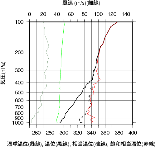 表中のMUCAPE850hPaは、最不安定CAPE(地上~850hPa高度間で)を示す。 気温、露点の鉛直分布(エマグラム)潮岬 2003年10月13日21時(高層気象観測データを使用)![]() 赤線は、地表付近の空気塊を仮想的に上昇させたときの空気塊の温度の変化を示す。 湿球温位、温位、相当温位、飽和相当温位の鉛直分布潮岬 2003年10月13日21時(高層気象観測データを使用)![]() 風のホドグラフ(広域)潮岬 2003年10月13日21時(高層気象観測データを使用)![]() 風のホドグラフ(拡大)潮岬 2003年10月13日21時(高層気象観測データを使用)![]() |
