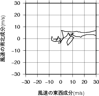 表中のMUCAPE850hPaは、最不安定CAPE(地上~850hPa高度間で)を示す。 気温、露点の鉛直分布(エマグラム)館野 2006年06月28日21時(高層気象観測データを使用)![]() 赤線は、地表付近の空気塊を仮想的に上昇させたときの空気塊の温度の変化を示す。 湿球温位、温位、相当温位、飽和相当温位の鉛直分布館野 2006年06月28日21時(高層気象観測データを使用)![]() 風のホドグラフ(広域)館野 2006年06月28日21時(高層気象観測データを使用)![]() 風のホドグラフ(拡大)館野 2006年06月28日21時(高層気象観測データを使用)![]() |
