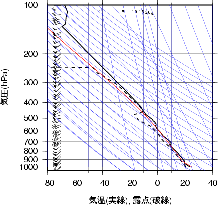 表中のMUCAPE850hPaは、最不安定CAPE(地上~850hPa高度間で)を示す。 気温、露点の鉛直分布(エマグラム)輪島 2006年07月02日09時(高層気象観測データを使用)![]() 赤線は、地表付近の空気塊を仮想的に上昇させたときの空気塊の温度の変化を示す。 湿球温位、温位、相当温位、飽和相当温位の鉛直分布輪島 2006年07月02日09時(高層気象観測データを使用)![]() 風のホドグラフ(広域)輪島 2006年07月02日09時(高層気象観測データを使用)![]() 風のホドグラフ(拡大)輪島 2006年07月02日09時(高層気象観測データを使用)![]() |