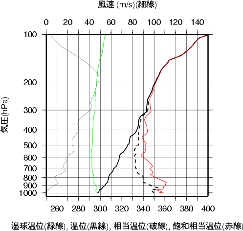 表中のMUCAPE850hPaは、最不安定CAPE(地上~850hPa高度間で)を示す。 気温、露点の鉛直分布(エマグラム)館野 2006年07月02日21時(高層気象観測データを使用)![]() 赤線は、地表付近の空気塊を仮想的に上昇させたときの空気塊の温度の変化を示す。 湿球温位、温位、相当温位、飽和相当温位の鉛直分布館野 2006年07月02日21時(高層気象観測データを使用)![]() 風のホドグラフ(広域)館野 2006年07月02日21時(高層気象観測データを使用)![]() 風のホドグラフ(拡大)館野 2006年07月02日21時(高層気象観測データを使用)![]() |