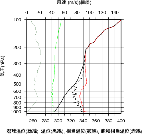 表中のMUCAPE850hPaは、最不安定CAPE(地上~850hPa高度間で)を示す。 気温、露点の鉛直分布(エマグラム)輪島 2008年07月12日09時(高層気象観測データを使用)![]() 赤線は、地表付近の空気塊を仮想的に上昇させたときの空気塊の温度の変化を示す。 湿球温位、温位、相当温位、飽和相当温位の鉛直分布輪島 2008年07月12日09時(高層気象観測データを使用)![]() 風のホドグラフ(広域)輪島 2008年07月12日09時(高層気象観測データを使用)![]() 風のホドグラフ(拡大)輪島 2008年07月12日09時(高層気象観測データを使用)![]() |
