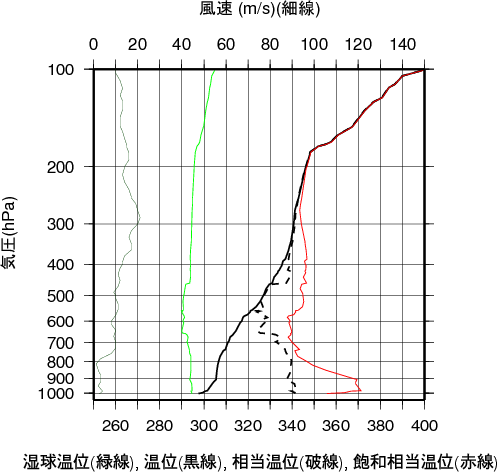 表中のMUCAPE850hPaは、最不安定CAPE(地上~850hPa高度間で)を示す。 気温、露点の鉛直分布(エマグラム)館野 2008年07月12日21時(高層気象観測データを使用)![]() 赤線は、地表付近の空気塊を仮想的に上昇させたときの空気塊の温度の変化を示す。 湿球温位、温位、相当温位、飽和相当温位の鉛直分布館野 2008年07月12日21時(高層気象観測データを使用)![]() 風のホドグラフ(広域)館野 2008年07月12日21時(高層気象観測データを使用)![]() 風のホドグラフ(拡大)館野 2008年07月12日21時(高層気象観測データを使用)![]() |