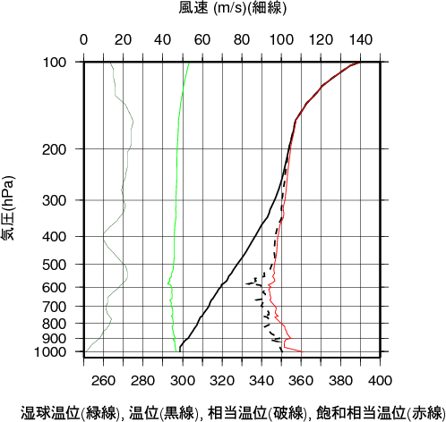 表中のMUCAPE850hPaは、最不安定CAPE(地上~850hPa高度間で)を示す。 気温、露点の鉛直分布(エマグラム)輪島 2008年07月25日09時(高層気象観測データを使用)![]() 赤線は、地表付近の空気塊を仮想的に上昇させたときの空気塊の温度の変化を示す。 湿球温位、温位、相当温位、飽和相当温位の鉛直分布輪島 2008年07月25日09時(高層気象観測データを使用)![]() 風のホドグラフ(広域)輪島 2008年07月25日09時(高層気象観測データを使用)![]() 風のホドグラフ(拡大)輪島 2008年07月25日09時(高層気象観測データを使用)![]() |