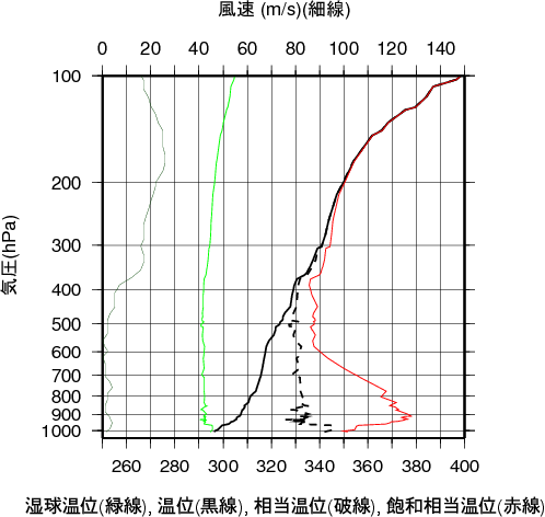 表中のMUCAPE850hPaは、最不安定CAPE(地上~850hPa高度間で)を示す。 気温、露点の鉛直分布(エマグラム)輪島 2008年08月08日21時(高層気象観測データを使用)![]() 赤線は、地表付近の空気塊を仮想的に上昇させたときの空気塊の温度の変化を示す。 湿球温位、温位、相当温位、飽和相当温位の鉛直分布輪島 2008年08月08日21時(高層気象観測データを使用)![]() 風のホドグラフ(広域)輪島 2008年08月08日21時(高層気象観測データを使用)![]() 風のホドグラフ(拡大)輪島 2008年08月08日21時(高層気象観測データを使用)![]() |
