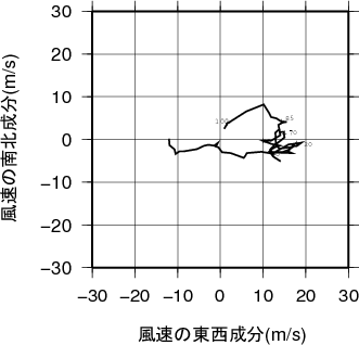 表中のMUCAPE850hPaは、最不安定CAPE(地上~850hPa高度間で)を示す。 気温、露点の鉛直分布(エマグラム)輪島 2008年08月14日09時(高層気象観測データを使用)![]() 赤線は、地表付近の空気塊を仮想的に上昇させたときの空気塊の温度の変化を示す。 湿球温位、温位、相当温位、飽和相当温位の鉛直分布輪島 2008年08月14日09時(高層気象観測データを使用)![]() 風のホドグラフ(広域)輪島 2008年08月14日09時(高層気象観測データを使用)![]() 風のホドグラフ(拡大)輪島 2008年08月14日09時(高層気象観測データを使用)![]() |