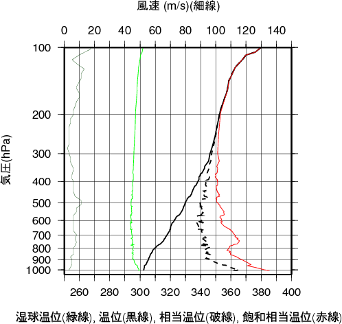 表中のMUCAPE850hPaは、最不安定CAPE(地上~850hPa高度間で)を示す。 気温、露点の鉛直分布(エマグラム)石垣島 2009年07月30日21時(高層気象観測データを使用)![]() 赤線は、地表付近の空気塊を仮想的に上昇させたときの空気塊の温度の変化を示す。 湿球温位、温位、相当温位、飽和相当温位の鉛直分布石垣島 2009年07月30日21時(高層気象観測データを使用)![]() 風のホドグラフ(広域)石垣島 2009年07月30日21時(高層気象観測データを使用)![]() 風のホドグラフ(拡大)石垣島 2009年07月30日21時(高層気象観測データを使用)![]() |