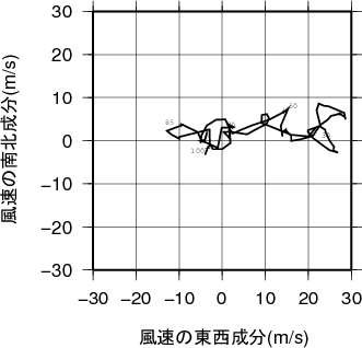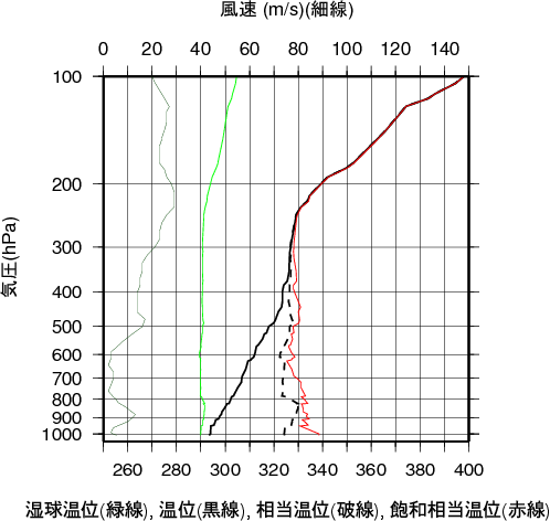 表中のMUCAPE850hPaは、最不安定CAPE(地上~850hPa高度間で)を示す。 気温、露点の鉛直分布(エマグラム)鹿児島 2009年11月13日09時(高層気象観測データを使用)![]() 赤線は、地表付近の空気塊を仮想的に上昇させたときの空気塊の温度の変化を示す。 湿球温位、温位、相当温位、飽和相当温位の鉛直分布鹿児島 2009年11月13日09時(高層気象観測データを使用)![]() 風のホドグラフ(広域)鹿児島 2009年11月13日09時(高層気象観測データを使用)![]() 風のホドグラフ(拡大)鹿児島 2009年11月13日09時(高層気象観測データを使用)![]() |