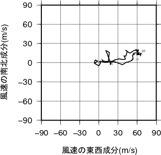 表中のMUCAPE850hPaは、最不安定CAPE(地上~850hPa高度間で)を示す。 気温、露点の鉛直分布(エマグラム)米子 2009年12月17日21時(高層気象観測データを使用)![]() 赤線は、地表付近の空気塊を仮想的に上昇させたときの空気塊の温度の変化を示す。 湿球温位、温位、相当温位、飽和相当温位の鉛直分布米子 2009年12月17日21時(高層気象観測データを使用)![]() 風のホドグラフ(広域)米子 2009年12月17日21時(高層気象観測データを使用)![]() 風のホドグラフ(拡大)米子 2009年12月17日21時(高層気象観測データを使用)![]() |