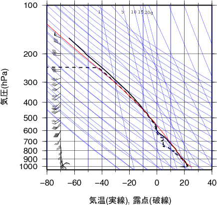 表中のMUCAPE850hPaは、最不安定CAPE(地上~850hPa高度間で)を示す。 気温、露点の鉛直分布(エマグラム)潮岬 2010年06月25日21時(高層気象観測データを使用)![]() 赤線は、地表付近の空気塊を仮想的に上昇させたときの空気塊の温度の変化を示す。 湿球温位、温位、相当温位、飽和相当温位の鉛直分布潮岬 2010年06月25日21時(高層気象観測データを使用)![]() 風のホドグラフ(広域)潮岬 2010年06月25日21時(高層気象観測データを使用)![]() 風のホドグラフ(拡大)潮岬 2010年06月25日21時(高層気象観測データを使用)![]() |