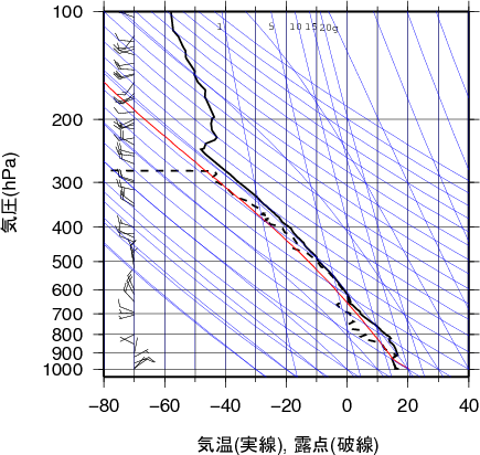 表中のMUCAPE850hPaは、最不安定CAPE(地上~850hPa高度間で)を示す。 気温、露点の鉛直分布(エマグラム)稚内 2010年07月04日21時(高層気象観測データを使用)![]() 赤線は、地表付近の空気塊を仮想的に上昇させたときの空気塊の温度の変化を示す。 湿球温位、温位、相当温位、飽和相当温位の鉛直分布稚内 2010年07月04日21時(高層気象観測データを使用)![]() 風のホドグラフ(広域)稚内 2010年07月04日21時(高層気象観測データを使用)![]() 風のホドグラフ(拡大)稚内 2010年07月04日21時(高層気象観測データを使用)![]() |