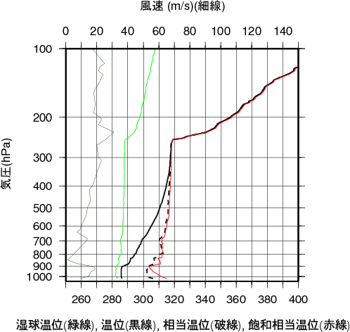 表中のMUCAPE850hPaは、最不安定CAPE(地上~850hPa高度間で)を示す。 気温、露点の鉛直分布(エマグラム)稚内 2012年09月25日09時(高層気象観測データを使用)![]() 赤線は、地表付近の空気塊を仮想的に上昇させたときの空気塊の温度の変化を示す。 湿球温位、温位、相当温位、飽和相当温位の鉛直分布稚内 2012年09月25日09時(高層気象観測データを使用)![]() 風のホドグラフ(広域)稚内 2012年09月25日09時(高層気象観測データを使用)![]() 風のホドグラフ(拡大)稚内 2012年09月25日09時(高層気象観測データを使用)![]() |