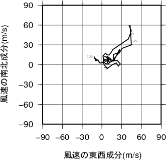 表中のMUCAPE850hPaは、最不安定CAPE(地上~850hPa高度間で)を示す。 気温、露点の鉛直分布(エマグラム)秋田 2012年09月25日09時(高層気象観測データを使用)![]() 赤線は、地表付近の空気塊を仮想的に上昇させたときの空気塊の温度の変化を示す。 湿球温位、温位、相当温位、飽和相当温位の鉛直分布秋田 2012年09月25日09時(高層気象観測データを使用)![]() 風のホドグラフ(広域)秋田 2012年09月25日09時(高層気象観測データを使用)![]() 風のホドグラフ(拡大)秋田 2012年09月25日09時(高層気象観測データを使用)![]() |