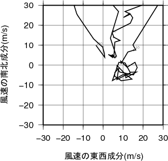 表中のMUCAPE850hPaは、最不安定CAPE(地上~850hPa高度間で)を示す。 気温、露点の鉛直分布(エマグラム)札幌 2012年10月28日21時(高層気象観測データを使用)![]() 赤線は、地表付近の空気塊を仮想的に上昇させたときの空気塊の温度の変化を示す。 湿球温位、温位、相当温位、飽和相当温位の鉛直分布札幌 2012年10月28日21時(高層気象観測データを使用)![]() 風のホドグラフ(広域)札幌 2012年10月28日21時(高層気象観測データを使用)![]() 風のホドグラフ(拡大)札幌 2012年10月28日21時(高層気象観測データを使用)![]() |
