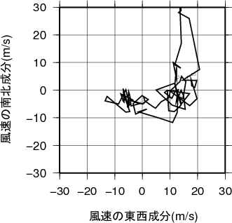 表中のMUCAPE850hPaは、最不安定CAPE(地上~850hPa高度間で)を示す。 気温、露点の鉛直分布(エマグラム)秋田 2012年10月29日09時(高層気象観測データを使用)![]() 赤線は、地表付近の空気塊を仮想的に上昇させたときの空気塊の温度の変化を示す。 湿球温位、温位、相当温位、飽和相当温位の鉛直分布秋田 2012年10月29日09時(高層気象観測データを使用)![]() 風のホドグラフ(広域)秋田 2012年10月29日09時(高層気象観測データを使用)![]() 風のホドグラフ(拡大)秋田 2012年10月29日09時(高層気象観測データを使用)![]() |