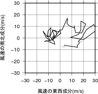 表中のMUCAPE850hPaは、最不安定CAPE(地上~850hPa高度間で)を示す。 気温、露点の鉛直分布(エマグラム)潮岬 2012年11月13日21時(高層気象観測データを使用)![]() 赤線は、地表付近の空気塊を仮想的に上昇させたときの空気塊の温度の変化を示す。 湿球温位、温位、相当温位、飽和相当温位の鉛直分布潮岬 2012年11月13日21時(高層気象観測データを使用)![]() 風のホドグラフ(広域)潮岬 2012年11月13日21時(高層気象観測データを使用)![]() 風のホドグラフ(拡大)潮岬 2012年11月13日21時(高層気象観測データを使用)![]() |