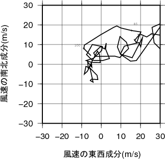 表中のMUCAPE850hPaは、最不安定CAPE(地上~850hPa高度間で)を示す。 気温、露点の鉛直分布(エマグラム)秋田 2012年11月28日21時(高層気象観測データを使用)![]() 赤線は、地表付近の空気塊を仮想的に上昇させたときの空気塊の温度の変化を示す。 湿球温位、温位、相当温位、飽和相当温位の鉛直分布秋田 2012年11月28日21時(高層気象観測データを使用)![]() 風のホドグラフ(広域)秋田 2012年11月28日21時(高層気象観測データを使用)![]() 風のホドグラフ(拡大)秋田 2012年11月28日21時(高層気象観測データを使用)![]() |