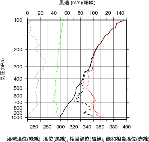 表中のMUCAPE850hPaは、最不安定CAPE(地上~850hPa高度間で)を示す。 気温、露点の鉛直分布(エマグラム)秋田 2015年08月06日21時(高層気象観測データを使用)![]() 赤線は、地表付近の空気塊を仮想的に上昇させたときの空気塊の温度の変化を示す。 湿球温位、温位、相当温位、飽和相当温位の鉛直分布秋田 2015年08月06日21時(高層気象観測データを使用)![]() 風のホドグラフ(広域)秋田 2015年08月06日21時(高層気象観測データを使用)![]() 風のホドグラフ(拡大)秋田 2015年08月06日21時(高層気象観測データを使用)![]() |