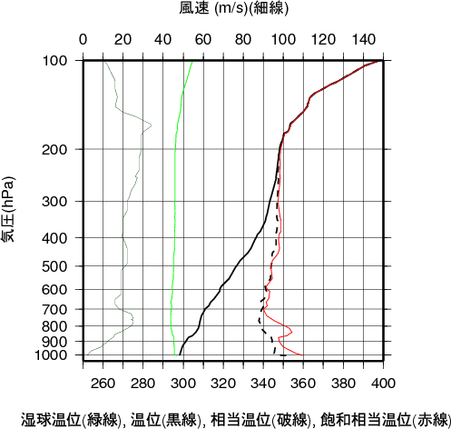 表中のMUCAPE850hPaは、最不安定CAPE(地上~850hPa高度間で)を示す。 気温、露点の鉛直分布(エマグラム)鹿児島 2015年08月29日21時(高層気象観測データを使用)![]() 赤線は、地表付近の空気塊を仮想的に上昇させたときの空気塊の温度の変化を示す。 湿球温位、温位、相当温位、飽和相当温位の鉛直分布鹿児島 2015年08月29日21時(高層気象観測データを使用)![]() 風のホドグラフ(広域)鹿児島 2015年08月29日21時(高層気象観測データを使用)![]() 風のホドグラフ(拡大)鹿児島 2015年08月29日21時(高層気象観測データを使用)![]() |