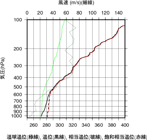 表中のMUCAPE850hPaは、最不安定CAPE(地上~850hPa高度間で)を示す。 気温、露点の鉛直分布(エマグラム)輪島 2016年02月26日09時(高層気象観測データを使用)![]() 赤線は、地表付近の空気塊を仮想的に上昇させたときの空気塊の温度の変化を示す。 湿球温位、温位、相当温位、飽和相当温位の鉛直分布輪島 2016年02月26日09時(高層気象観測データを使用)![]() 風のホドグラフ(広域)輪島 2016年02月26日09時(高層気象観測データを使用)![]() 風のホドグラフ(拡大)輪島 2016年02月26日09時(高層気象観測データを使用)![]() |