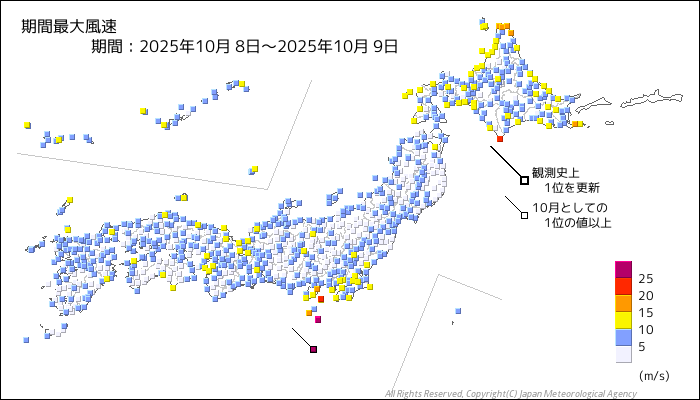 特定期間の風の状況(2025年10月 8日~2025年10月 9日)