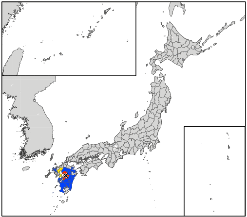 | 長周期地震動に関する観測情報(試行) 【地震の概要】 地震発生日時 平成28年(2016年)4月14日 21時26分34.4秒 震央地名 熊本県熊本地方 緯度 北緯32度44.5分 経度 東経130度48.5分 深さ 11km マグニチュード 6.5 【長周期地震動階級1以上が観測された地域】 長周期地震動階級3 熊本県熊本 長周期地震動階級2 佐賀県南部 長崎県島原半島 長周期地震動階級1 福岡県筑後 長崎県北部 熊本県阿蘇 熊本県球磨 熊本県天草・芦北 大分県中部 大分県西部 宮崎県北部平野部 宮崎県北部山沿い 宮崎県南部平野部 宮崎県南部山沿い 鹿児島県薩摩 |