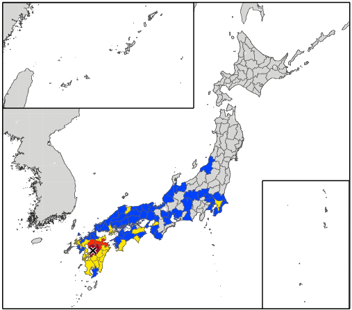 | 長周期地震動に関する観測情報(試行) 【地震の概要】 地震発生日時 平成28年(2016年)4月16日 01時25分05.4秒 震央地名 熊本県熊本地方 緯度 北緯32度45.2分 経度 東経130度45.7分 深さ 12km マグニチュード 7.3 【長周期地震動階級1以上が観測された地域】 長周期地震動階級4 熊本県阿蘇 熊本県熊本 長周期地震動階級3 福岡県筑後 大分県中部 大分県西部 長周期地震動階級2 千葉県北西部 大阪府南部 鳥取県西部 徳島県北部 高知県東部 高知県西部 山口県東部 佐賀県南部 長崎県北部 長崎県島原半島 熊本県球磨 熊本県天草・芦北 大分県北部 大分県南部 宮崎県北部平野部 宮崎県北部山沿い 宮崎県南部平野部 宮崎県南部山沿い 鹿児島県薩摩 長周期地震動階級1 茨城県南部 群馬県南部 埼玉県北部 埼玉県南部 千葉県北東部 千葉県南部 東京都23区 神奈川県東部 新潟県下越 富山県東部 富山県西部 石川県加賀 福井県嶺北 福井県嶺南 長野県中部 長野県南部 静岡県西部 愛知県西部 三重県北部 三重県中部 滋賀県南部 京都府北部 大阪府北部 兵庫県北部 兵庫県南東部 兵庫県南西部 兵庫県淡路島 和歌山県北部 和歌山県南部 鳥取県東部 鳥取県中部 島根県東部 島根県西部 岡山県北部 岡山県南部 広島県北部 広島県南東部 広島県南西部 徳島県南部 香川県西部 愛媛県東予 愛媛県中予 愛媛県南予 高知県中部 山口県北部 山口県西部 山口県中部 福岡県福岡 福岡県北九州 福岡県筑豊 佐賀県北部 長崎県南西部 長崎県壱岐 鹿児島県大隅 |