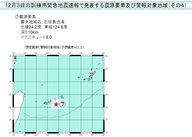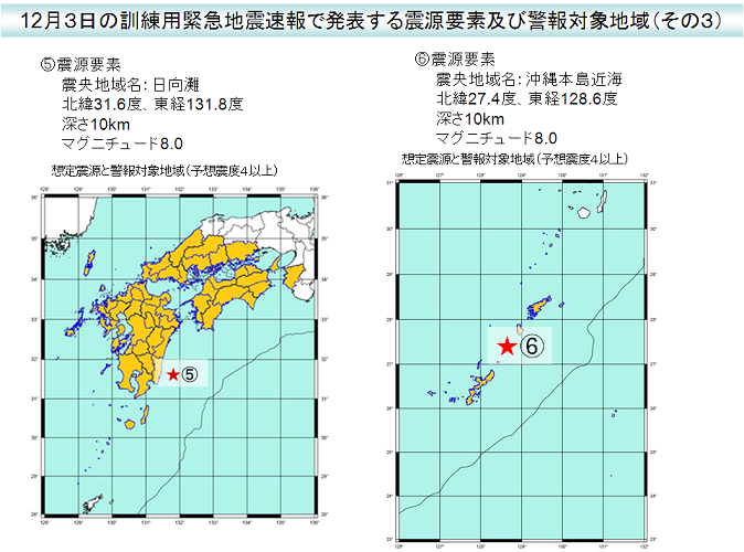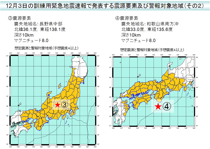 配信する訓練用の緊急地震速報による強い揺れの地域と震源要素