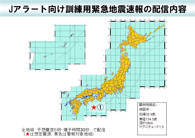 なお、気象庁は国の機関や地方公共団体(全国瞬時警報システム(以下「Jアラート」という)経由)、民間の緊急地震速報を提供する事業者のうち、 訓練への参加を計画している機関や団体に対して、訓練用の緊急地震速報を配信します。