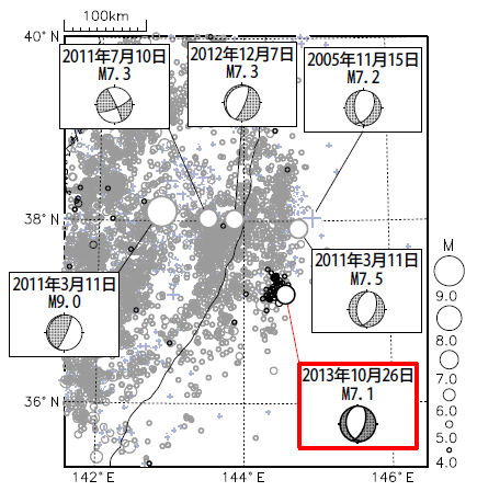 平成25年(2013年)10月26日2時10分、福島県沖の深さ56kmでMw7.1の地震が発生した。発震機構(気象庁CMT解)は東西方向に張力軸を持つ正断層型であった。 (地震の詳細は、平成25年10月地震・火山月報(防災編)を参照)