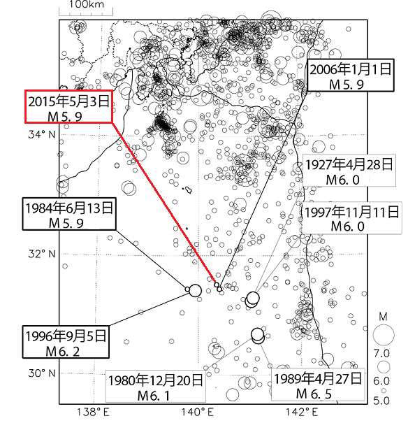 | 2015年5月3日01時50分 | 鳥島近海 | 北緯31度31.0分 | 東経140度21.2分 | 28km | 5.9 | 5.7 |