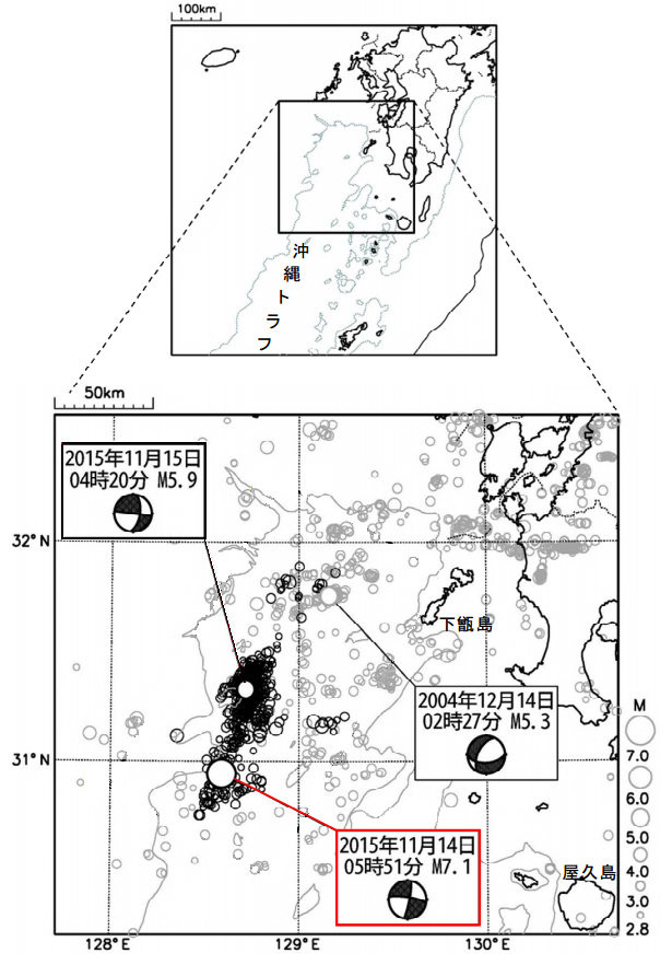 | 2015年11月14日 05時51分 | 薩摩半島西方沖 | 北緯30度56.5分 | 東経128度35.4分 | 17km | 7.1 | 6.7 |