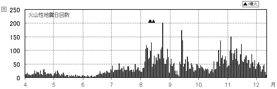 11日に行った現地調査では、二酸化硫黄放出量は一日あたり2,000〜2,700トン(前回11月20日、1,600〜2,200トン)と依然として多量の火山ガス放出が続いている。