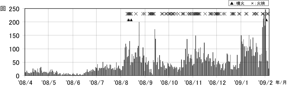 図2 浅間山 火山性地震の日別回数(2008年4月1日〜2009年2月5日)