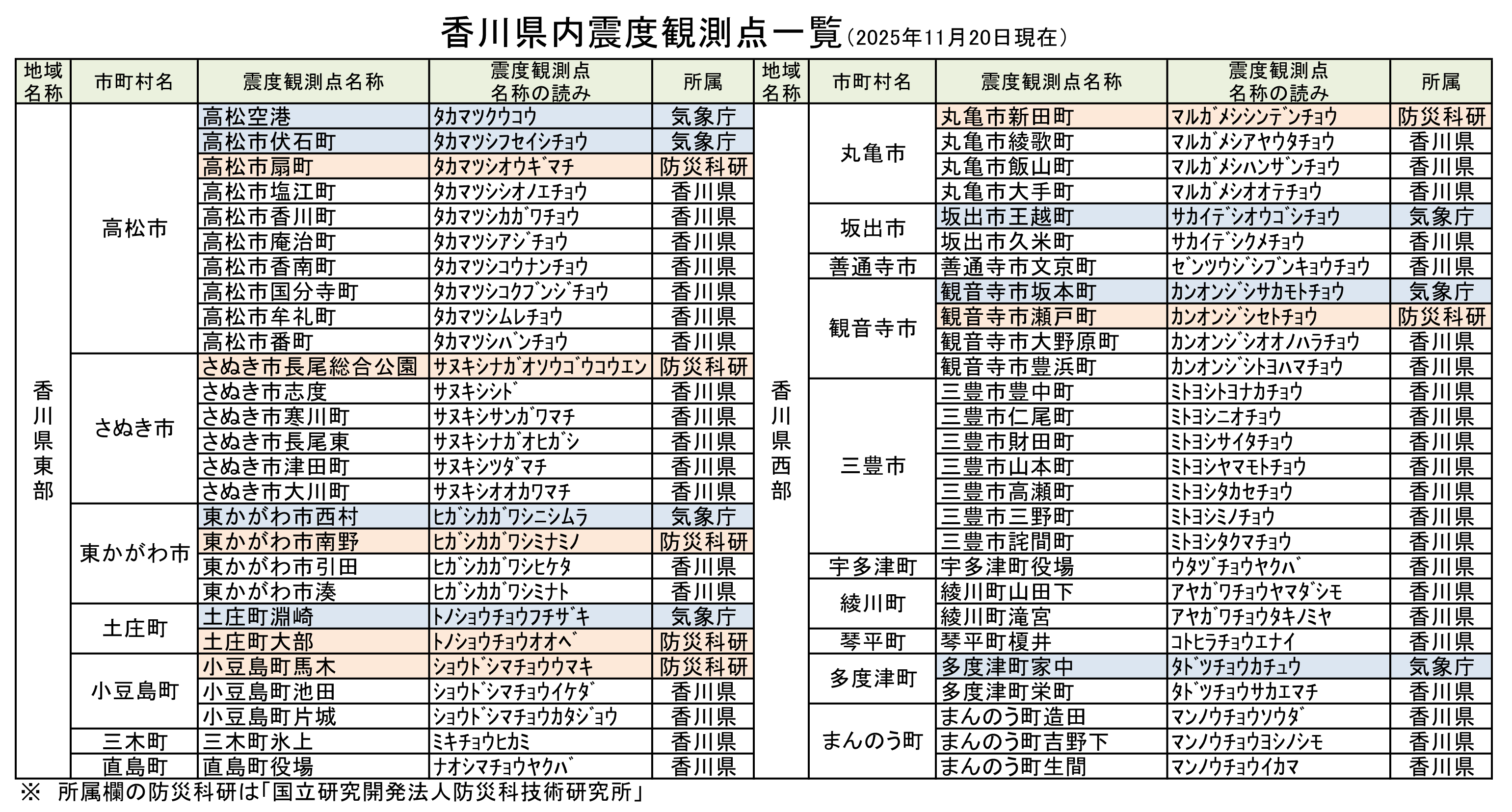 ![]() 赤丸:気象庁 緑四角:地方自治体(香川県) 青三角:国立研究開発法人防災科学技術研究所 |