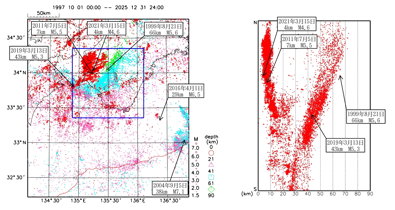 ②沈み込むフィリピン海プレート内部の地震は、三重県から紀伊水道にかけてのやや深い深さ30~70kmの場所で発生しています。この場所ではM5以上の地震が時々発生しており、1999年8月21日の和歌山県北部の地震(M5.6、深さ66km)では最大震度5弱を観測するなど、強い揺れになることもあります。