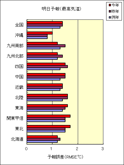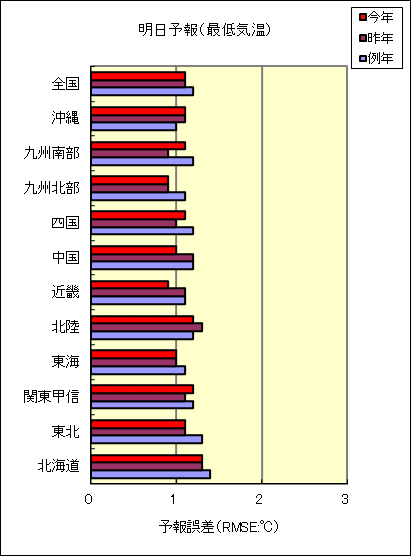 | (注3)「最高気温」「最低気温」の予報誤差(RMSE)は、「検証方法の説明」を参照してください。 |