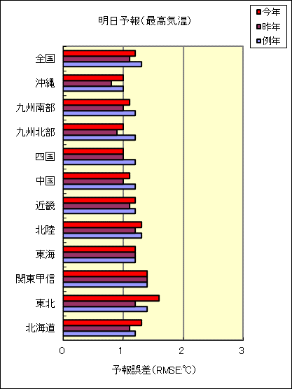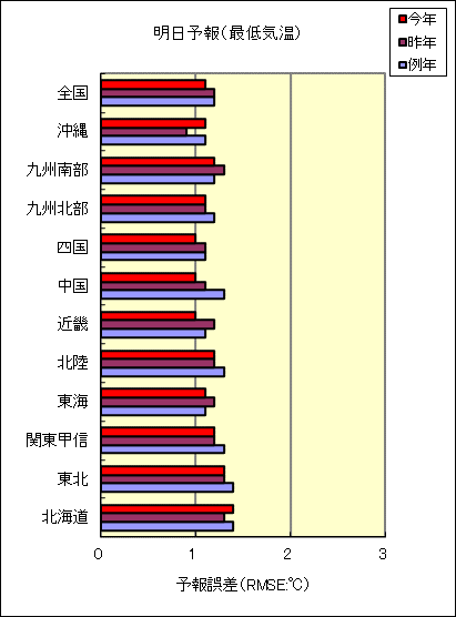 | (注3)「最高気温」「最低気温」の予報誤差(RMSE)は、「検証方法の説明」を参照してください。 |