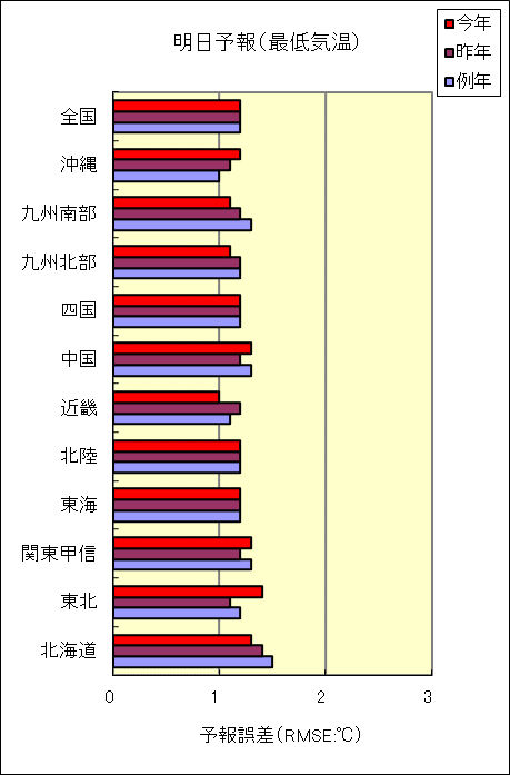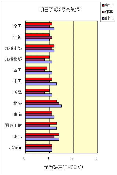 | (注3)「最高気温」「最低気温」の予報誤差(RMSE)は、「検証方法の説明」を参照してください。 |